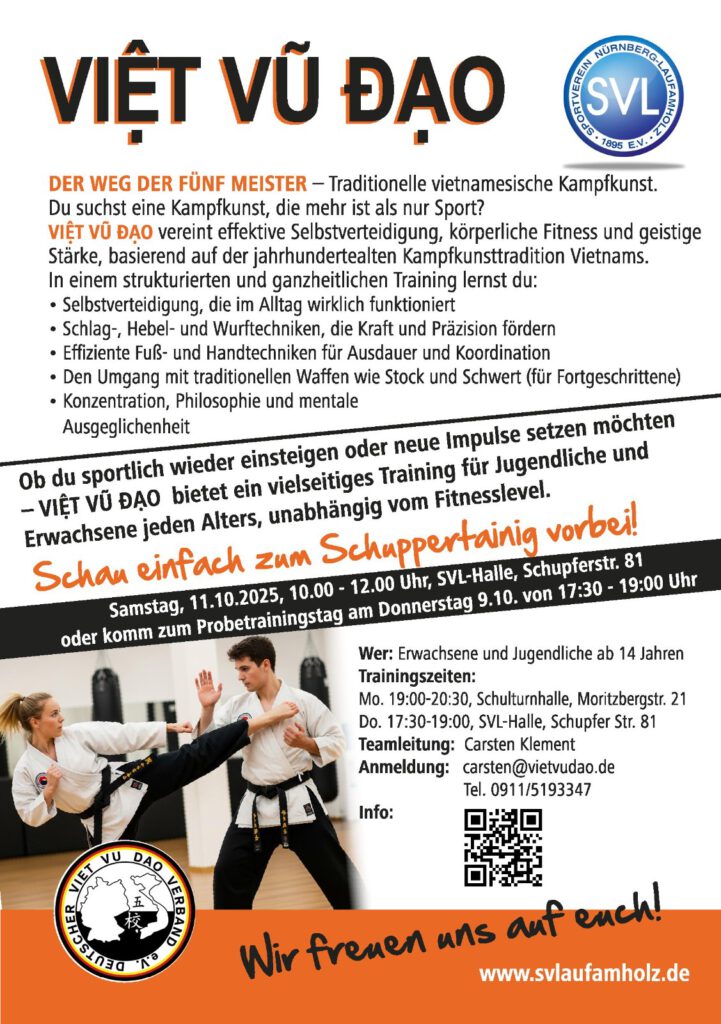 Im Oktober lädt der SV Laufamholz außerdem zu zwei offenen Schnuppertrainings ein, bei denen Interessierte die traditionelle Kampfkunst Viet Vu Dao kennenlernen können. Diese Sportart verbindet körperliche Stärke, innere Ruhe und Konzentration auf einzigartige Weise. Durch präzise Techniken mit Händen, Füßen und traditionellen Waffen entwickelt man nicht nur Selbstverteidigungskompetenz, sondern auch Fitness, Fokus und Selbstvertrauen. Eingeladen sind alle ab 14 Jahren, die Lust haben, etwas Neues auszuprobieren und in die faszinierende Welt des Viet Vu Dao einzutauchen.